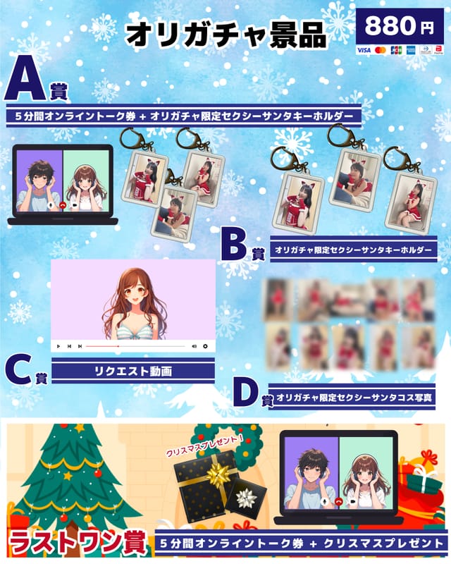 5分間のオンライントーク券とセクシーサンタコスのオリガチャ限定キーホルダーが3種のうち1種当たります!
