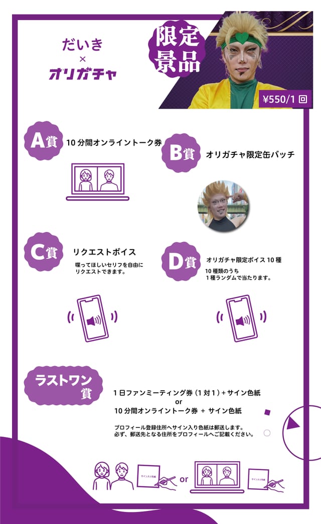1日ファンミーティング券(1対1)+サイン色紙 or 10分間オンライントーク券+サイン色紙