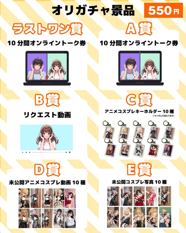 非公開コスプレ写真を10種用意しており、1種類が当たります。
