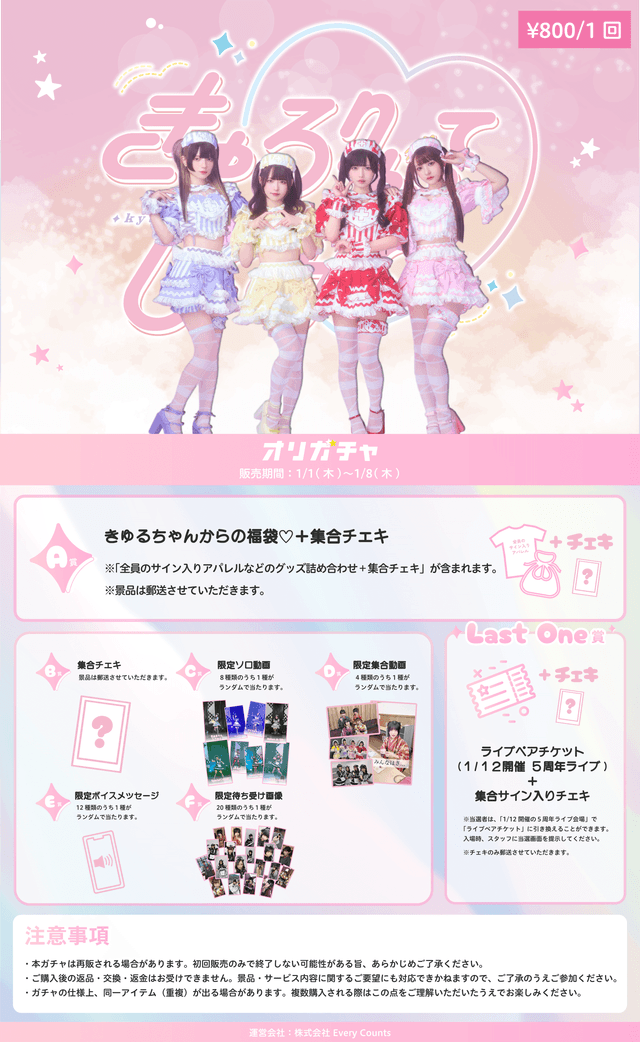 「全員のサイン入りアパレルなどのグッズ詰め合わせ+集合チェキ」が当たります!