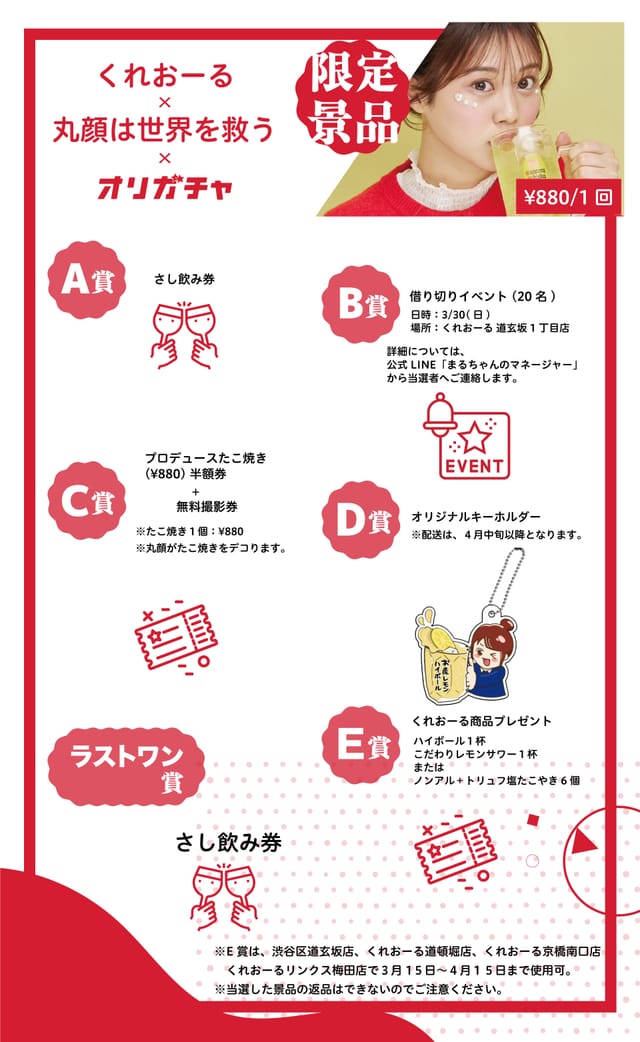 3/30に使えるたこ焼き1個¥880の半額券と丸顔との無料ツーショット券が当たります。丸顔がたこ焼きにデコレーションします。必ず当選景品は、実際に使用するタイミングでボタンを押してください。